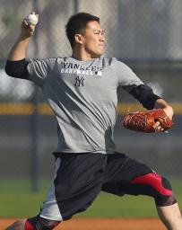 【タンパ(米フロリダ州)共同】米大リーグ、ヤンキースに入団した田中将大投手(25)が13日、球団のマイナー施設で初めてブルペン入りした。キャッチボールの後に捕手役を立たせて5球、座らせてからスプリットなどの変化球を交えて23球を投げた。