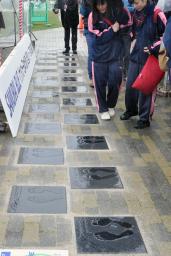 式に出席した竹山修身堺市長は「サッカーを名物に堺市を振興していきたい」とあいさつした。レリーフを見に来た人は自分の足と足形の大きさを比べ、写真を撮っていた。