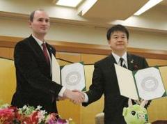 清水勇人市長と、ツール本大会主催会社のジャンエティエンヌ・アモリ社長が、フランスのスポーツ大臣バレリー・フルネロン氏も同席する中、開催合意書に調印。